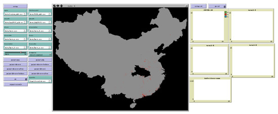 The SDPM built on NetLogo has a friendly interface that can be conveniently operated (as shown in Figure 4). In this model, various simulation scenarios can be automatically simulated and run by inputting the initial operating parameters. Moreover, changes in the epidemic distribution can be dynamically monitored in real time, as well as dynamic changes in macro data. For map display data, the model outputs data in standard ASCII format, which can be easily imported into ArcGIS and other software for further data analysis and mining. For macro statistics, the model outputs data in a standard CSV format. The output of the standard data results provides a basis for further research.