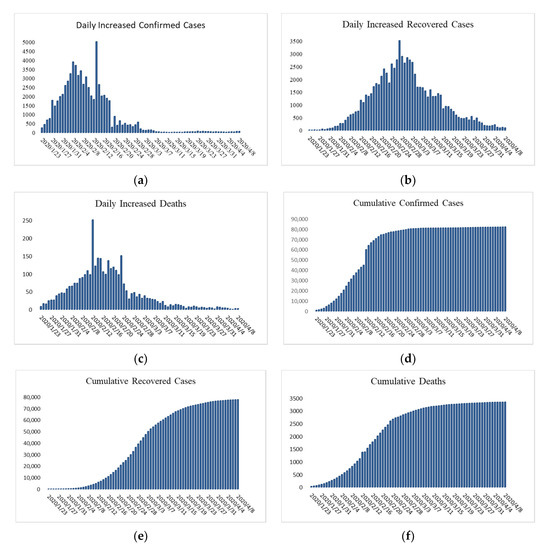 Number of daily increased and cumulative cases for confirmed cases, recovered cases, and deaths. (a) Daily increased confirmed cases; (b) daily increased recovered cases; (c) daily increased deaths; (d) cumulative confirmed cases; (e) cumulative recovered cases; (f) cumulative deaths.
