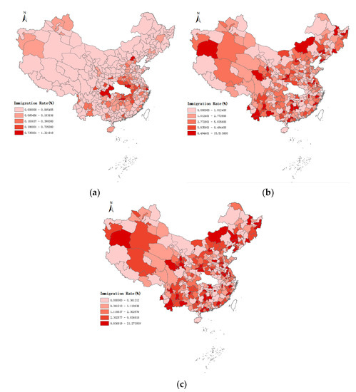 In addition, we obtained the migration rates from Wuhan to other prefecture-level cities (excluding Hong Kong, Macao, and Taiwan), and the migration rates from Hubei Province to other prefecture-level cities (excluding Hong Kong, Macao, and Taiwan). The data were spatially vectorized and obtained from the Baidu epidemic real-time big data report (https://voice.baidu.com/act/newpneumonia/newpneumonia, accessed on 8 April 2020). In this study, the average level of population migration from Wuhan to other prefecture-level cities (excluding Hong Kong, Macao, and Taiwan) before Wuhan’s closure of all channels was obtained, as well as the average level of population migration from Hubei Province to other prefecture-level cities (excluding Hong Kong, Macao, and Taiwan) before and after the Spring Festival travel season, respectively (Figure 6).