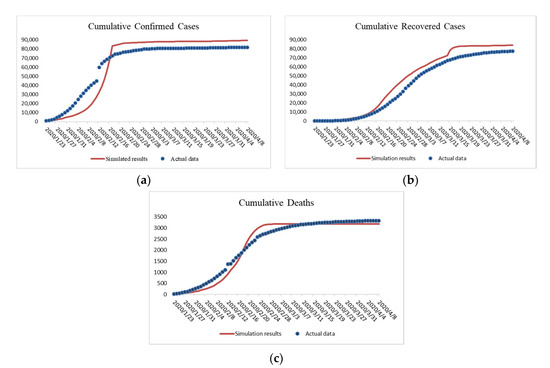 Epidemic cumulative cases simulation precision from 23 January 2020 to 8 April 2020. (a) Simulation precision for cumulative confirmed cases; (b) simulation precision for cumulative recovered cases; (c) simulation precision for cumulative deaths.
