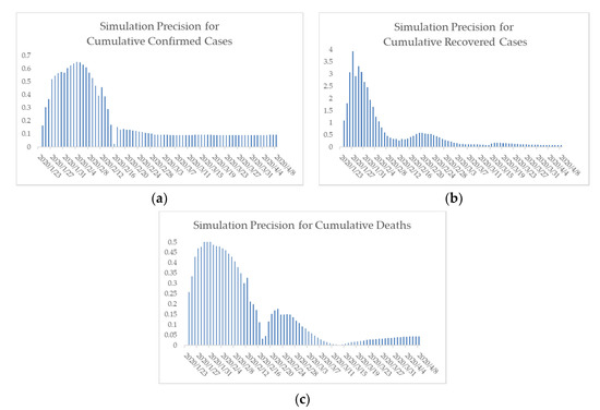 Based on the SEIR-SD model, we simulated the trend of cumulative confirmed cases, cumulative cured cases, and cumulative death cases with respect to the time from 23 January 2020 to 8 April 2020 (Figure 7). Through a visual comparison, it can be seen that the simulation results are relatively close to the real data. Simultaneously, we quantitatively calculated the simulation precision (as shown in Figure 8). It can be seen from Figure 8 that, in addition to some deviations in the simulation effect of the cumulative recovered cases, the cumulative confirmed cases and cumulative death cases both achieved good simulation results.