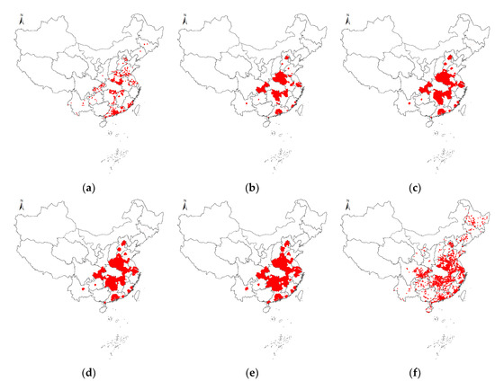 The spatial location data of daily COVID-19 patients were collected in this study from Tencent Kandian (https://ncov.html5.qq.com/community, accessed on 20 March 2020) and Nandu Media (https://m.mp.oeeee.com/h5/pages/v20/nCovcase/, accessed on 20 March 2020). The national GDP and population spatial distribution data were obtained from the Resource and Environment Data Cloud Platform (http://www.resdc.cn/Default.aspx, accessed in 2015) [25]. Detailed data are shown in Table 1.