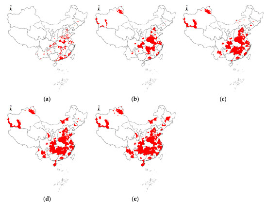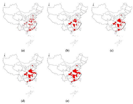 COVID-19 spread under tighter control measures. (a) 6 February 2020 (actual data); (b) 16 February 2020 (simulated data); (c) 26 February 2020 (simulated data); (d) 7 March 2020 (simulated data); (e) 20 March 2020 (simulated data).