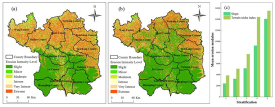 Soil erosion intensity in year of 2010 (a) and 2017 (b) and variation trend of mean erosion modulus under different stratification of terrain factors (t/km2·a) (c).
