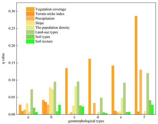 Based on factor detection, the comprehensive results demonstrate that the major factors controlling soil erosion, in order of q-values were: vegetation coverage (79.42%) > land-use types (52.43%) > population density (22.78%) > precipitation (21.70%) > slope (14.73%) > soil types (10.90%) > soil texture (9.71%) > terrain niche index (6.55%), and that the effect degree of influencing factors driving soil erosion was notably different in areas of different geomorphological types. In small-relief and low-elevation mountains, the type of land-use was the dominant factor. In mid-elevation plains, land-use types, slope and population density were the dominant factors. In mid-elevation terraces, vegetation coverage, population density and land-use types were the dominant factors. In small-relief and mid-elevation mountains, vegetation coverage was the dominant factor. In mid-elevation hills, vegetation coverage and land-use types were the dominant factors. In mid-relief and mid-elevation mountains, vegetation coverage, precipitation and land-use types were the dominant factors (Figure 5). The explanatory power of vegetation coverage gradient increased with elevation, whereas a “turnpoint” was observed in mid-elevation hills, down to 14.20%. The following patterns were observed for the explanatory power of those factors, including the population density, slope, and terrain niche index. The explanatory power of those factors was higher in relatively flat areas than that in mountainous and hilly areas, but it was generally low. Precipitation had a general low explanatory power affecting soil erosion among various geomorphological types, except in mid-relief and mid-elevation mountains (13%).