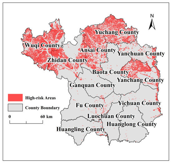 Based on the principle of risk detection, stratification of influencing factors by high-risk of soil erosion (soil erosion modulus ≥ 15,000 t/km2·a) can be determined (Table 7, and high-risk areas of soil erosion can be identified (Figure 6). In all geomorphological types, vegetation coverage was at a critical value in the range of 0.5–0.75, where the soil erosion modulus peaked and then decreased. The soil erosion modulus increased with the slope in all geomorphological types, except for small-relief and mid-elevation mountains and mid-relief and mid-elevation mountains. The land-use types prone to erosion were unused land, forest land and grassland. The soil types prone to erosion were skeletal soil and loessal soil, both of which are soft and loose. The soil texture types prone to erosion were sandy clay loam and loam with sand percentages of 55–85% and 40–55%, respectively (Table 7). The high-risk areas of soil erosion were mainly distributed in the northern and eastern edges of the study area, mainly located in the cultivated land (62.57%) and forest land (26.06%) in mid-elevation hills (Figure 6) (Table 8). The rehabilitation regions of small-relief and low-elevation mountains were concentrated in forest land (2.08%), grassland (1.31%) and unused land (0.48%) with steep slopes (>6°) and precipitation (590–620 mm). Regions of forest land (0.31%), grassland (0.32%) and unused land (0.27%) with steep slopes (>15°) and precipitation (590–660 mm) were focal areas of soil erosion prevention in mid-elevation plains. The rehabilitation regions of mid-elevation terraces were cultivated land and grassland with steep slopes (>15°). The rehabilitation regions of mid-relief and mid-elevation mountains were grassland and unused land with precipitation (560–590 mm).