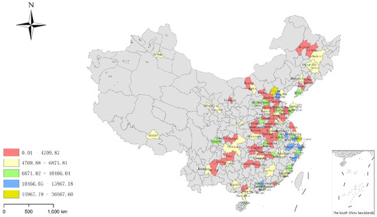 During both the socialist planned economy era and the early stage of the economic reform era, housing in Chinese cities was considered as part of the welfare provision package, while population mobility was constrained, and thus the spatial differentiation of housing was insignificant [50]. However, during the market-oriented development process of the housing sector, the widening regional economic inequality amplified by the massive urban–rural migration, as well as increasing city-to-city mobility, has led housing market conditions and institutional settings to rapidly exhibit substantial spatial variations across cities [24]. In particular, housing prices have shown increasingly significant spatial differences across different tiers of cities [51]. Figure 1 shows the spatial distribution of mean housing prices between 2014 and 2017 in 100 large and medium-sized sample cities.
