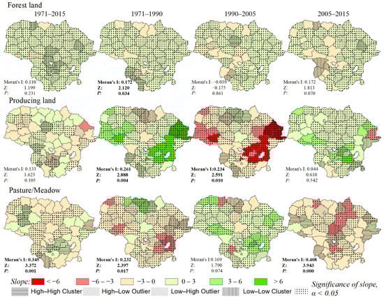 | 0.45 | 322.44 | 0.00 | 0.04 | 5.83 | 0.82 | −3.213562 + 0.826977 × [Soil productivity grade] ** − 0.1465 × [Land reclamation intensity] ** − 0.232591 × [Forest, 1971] *** − 0.433926 × [Producing land, 1971] *** |