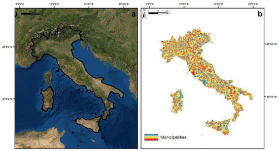 For a full understanding of the application reported in this study, it is worth noting that Italy is subdivided into 7904 municipalities (Figure 1b), which represent the smallest administrative subdivisions of the territory and that have important responsibilities in territorial planning, urban design and risk management.