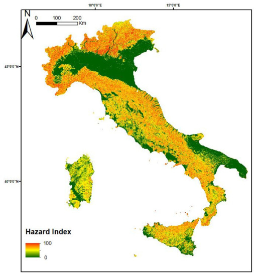 The first step of the proposed procedure consists of blending the three susceptibility maps into a single information. It can be considered quite unlikely that, in a single spatial unit of the susceptibility map (pixel with 50 m size), two or more landslides of different typologies could be contemporarily present. Indeed, every predictive landslide model should first make a typological prediction, trying to predict what kind of landslide will take place [55]. As a consequence, the three susceptibility maps were imported into ArcGis software, and the “cell statistics” operation was performed to assess the “maximum” value. In this way, the output is a raster map in which the susceptibility index associated to each cell is the highest value found in the three input maps. This is equivalent to considering the landslide type with the highest susceptible value as the most probable to occur in a given location, and surmising that this landslide typology is the one that will be most likely affecting that area, controlling the related hazard. The resulting raster will be called “hazard index map” henceforth (Figure 2).