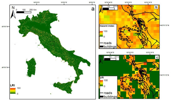 (a) Landslide Risk Index (LRI) map for the whole Italian territory; (b) Focus on hazard index map; (c) Focus on LRI map. Roads and buildings are from OpenStreetMap dataset.