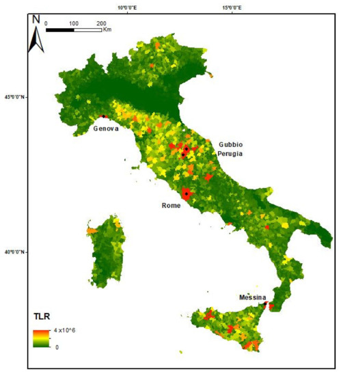 The TLR index (Figure 4) expresses for each mapping unit (municipalities in this study) the sum of the susceptibility values of all the cells with urbanized soil. Basically, this index cumulates for each administration the situations of interaction between spatial hazard and urbanized areas, expressing how much the development of the municipality has let hazardous areas to be “invaded” by constructions, infrastructure and services. In this regard, TLR could be used to describe the attention of an administration to harmonize the urban development with the main geomorphological hazard affecting its territory. Figure 4 shows that the Italian areas characterized by the highest TLR values are the Apennines (mainly the northern and central sectors), the isle of Sicily and, to a lesser extent, the eastern Alps. The drawback of this index is that it is sensitive to the extension of each aggregation unit: large municipalities have a greater chance than small ones to have a high TLR value, because of the higher number of pixels. For this reason, the value of the index does not have a fixed upper limit, and the value could theoretically tend to infinite, requiring particular attention for a correct interpretation. Indeed, when comparing different municipalities, a similarly high value of the index could be determined by many pixels with mid LRI values or by fewer pixels with higher LRI values. For this reason, the municipalities with the higher TLR index are large and densely urbanized municipalities. This result is not an artifact or a bias: the index effectively describes a recurring situation in some of the largest and most densely urbanized municipalities, which are exposed to a very high landslide risk in their territory because, during their urban expansion, they have had to cope with more hazardous areas than small municipalities. The highest values are found in the cities of Rome and Genova (both characterized by a very wide territory, densely populated and almost completely urbanized), and in the municipalities of Perugia, Gubbio and Messina, which are less populated but still have large portions of territory urbanized in hazardous areas (Figure 4). Nevertheless, TLR seems effective in highlighting the municipalities most affected by landslide risk, as the aforementioned territories correspond to areas where news about landslides continuously appear in newspapers and online blogs, as reported by [32]. In the last ten years, 4% of the landslide news catalogued and geotagged by their semantic engine is located in the aforementioned five municipalities with higher TLR values: in particular, 600 online news providers talked about landslides in Genova, 533 in Rome, and 235 in Messina.
