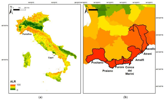 (a) Characterization of the Italian municipalities with the Average Landslide Risk (ALR) index; (b) Focus on the Amalfi Coast, where seven municipalities are ranked among the 10 Italian municipalities with the highest ALR value.