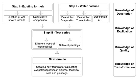 Three main steps were necessary to create the new equation for calculating evapotranspiration. The first and second step were described in a previous paper by Weiss et al. [19]. Information about test set-up and the test series in the climate chamber were described in detail. A short overview of the information given in the previous paper, will be presented in Section 2.1 and Section 2.2.