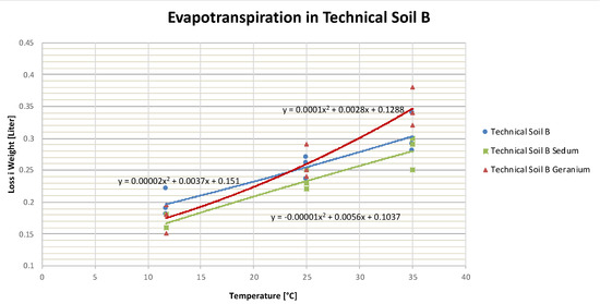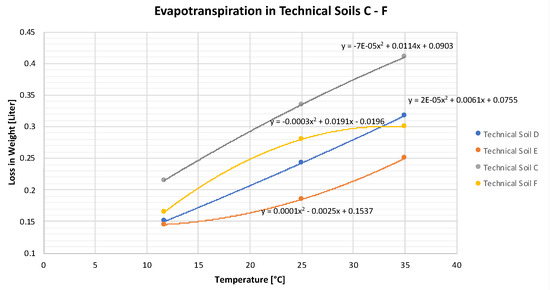 By using a polynomial trend line with the newly developed equation, evapotranspiration in liters for each soil combination within a 24 h day and for any chosen temperature can be easily calculated. Through insertion of any chosen x-value for the temperature, the created equation delivers a y-value for the evapotranspiration in liters per 24 h in the analyzed containers. To determine evapotranspiration of a technical soil per m2, the equation has to be divided by the surface area (0.0593957 m2) of the used containers.
