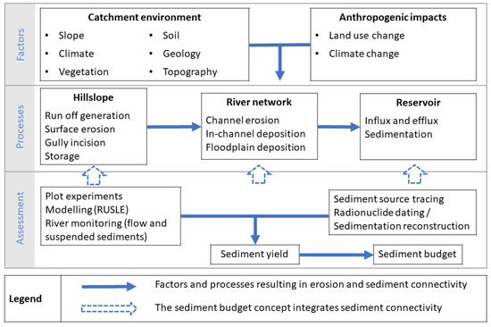 Understanding the processes that result in erosion and its connectivity to the river channel, storage in hillslopes, floodplains, and sediment accumulation in the reservoirs is vital for the choice of dam location and for the sustainable management of the reservoirs [190]. Sediment connectivity processes through time integrate sediment transfer processes across and sinks along the soil–sediment continuum of detachment, transport, and deposition [191]. The process of sediment delivery in the catchment is complex; it involves the interaction of multiple factors and processes on different spatial and temporal scales [192,193]. These complex systems cannot be understood by examining outcomes alone (e.g., sediment yield or SDR) [138]. The complexity of processes, feedbacks, and consequences require a system-wide perspective [138]. The sediment budget approach provides such a holistic perspective by accounting for the various sediment sources, transport, sinks, and redistribution when the sediment is routed through that catchment [138]. Policy makers and catchment managers can use the sediment budget approach as a realistic mechanism for targeting mitigation measures/strategies [152,190].