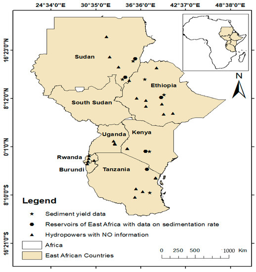 Sustainable land management and water resource development in many developing countries [47] are susceptible to accelerated erosion and downstream sediment transport [48,49]. Siltation of reservoirs is of utmost concern in regions of semi-arid catchments where water is insufficient, and land degradation commonly leads to increased masses of sediments entering rivers and reservoirs [50]. The storage capacity of reservoirs in East Africa is being reduced by accelerated sedimentation, which jeopardizes food, water, and energy security [51,52,53,54]. For example, Vanmaercke, Poesen, Broeckx, and Nyssen [40] showed that the sediment yields in East Africa typically range between 100 and 1000 t/km2/year. Studies on hydropower reservoirs by [55,56,57,58] and [59,60] also indicated similar sediment yields within the hydropower catchments of East Africa (Table 1).