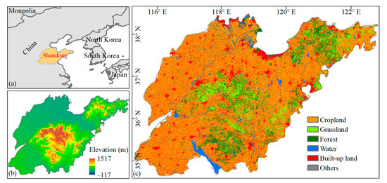 The location (a) and the elevation (b) of Shandong province, and the land use map in Shandong province in 2020 (c).