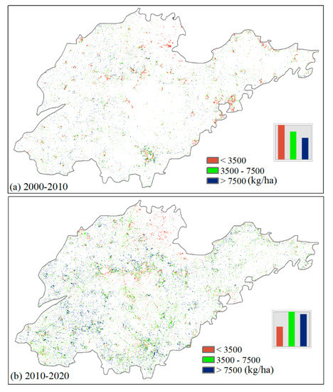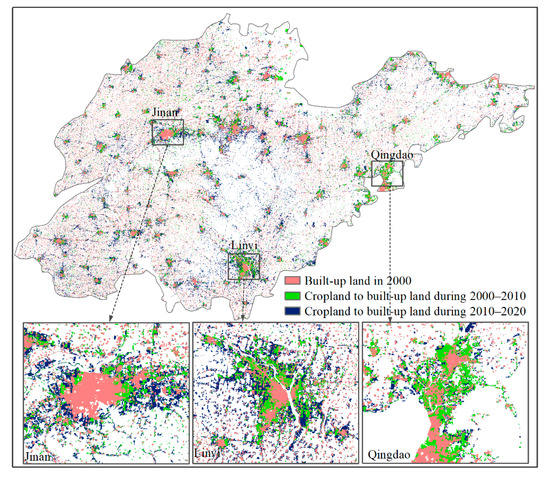 The spatial distribution of cropland occupied by built-up land during 2000–2010 and 2010–2020 is shown in Figure 4. The occupation of cropland by built-up land expansion concentrated around the existing built-up land. Higher tier cities in Shandong Province such as Jinan, Qingdao, and Linyi witnessed remarkable cropland losses from built-up land expansion (the bottom of Figure 4). This means the urbanization of mega-city has resulted in considerable cropland loss. In addition, some tiny scale cropland loss also appeared around the small towns or villages. Compared with the period of 2000–2010, the cropland loss to built-up land had expanded from the core of cities to the periphery during the period of 2010–2020.