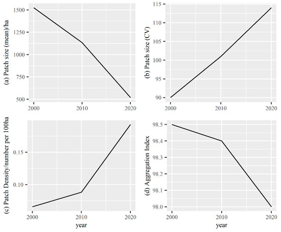 In addition to the cropland loss area, the expansion of built-up land usually caused the de-intensification of cropland. In this part, the landscape patterns of the cropland in 2000, 2010, and 2020 were assessed. Four representative landscape metrics of cropland were calculated for the whole region, including the mean patch size, the coefficient of variation of patch size, the patch density, and the aggregation index (Figure 5). The mean patch size of cropland decreased from 1524 ha in 2000 to 519 ha in 2020. The coefficient of variation of cropland patch size was 90, 101, and 114 for the year 2000, 2010, and 2020 respectively. The cropland patch density showed a notable increase trend from 2000 to 2020. Contrastingly, the aggregation index decreased over time. These results reflected that cropland had become smaller in patch size, and more isolated between patches throughout the two periods.