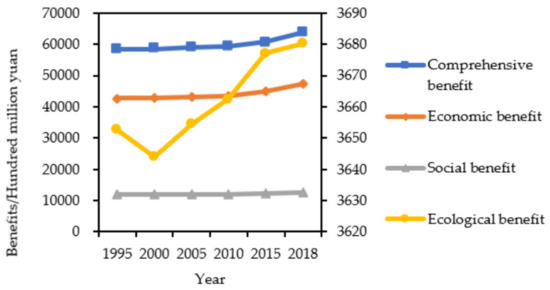 Vertically, the comprehensive land use benefits in the Yellow River Basin increased from 58,329.99 hundred million yuan in 1995 to 63,820.87 hundred million yuan in 2018, with an average increase of 9.41% (Figure 3). Economic benefits and social benefits also maintained a steady growth trend with an average increase of 11.06% and 6.16%, respectively. Both benefits grew fastest in 2015–2018 with annual growth rates of 1.91% and 1.12%, respectively. This period was between the end of the 12th 5-Year Plan and the beginning of the 13th 5-Year Plan. A series of macroeconomic policies such as economic structural adjustment and development mode transformation led to the continuous expansion of built-up land in the basin and the constant increase of regional GDP and per capita income. Ecological benefits fluctuated over time with an average increase of 0.76%, with the fastest growth rate of 0.08% per year in 2010–2015. Ecological benefits decreased but then increased in 1995–2000, which was closely related to the project of reforestation and returning pasture land to grass in 2000. In this period, the areas of grassland, water, and other ecological land expanded in the basin, which can improve the ecological environment.