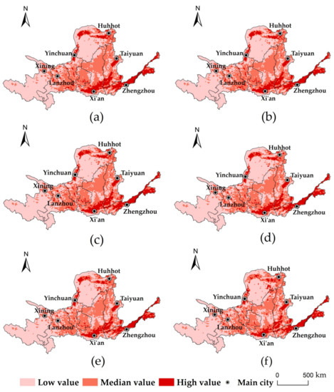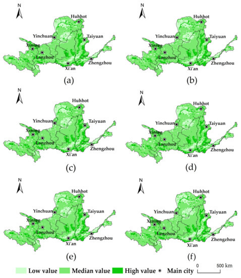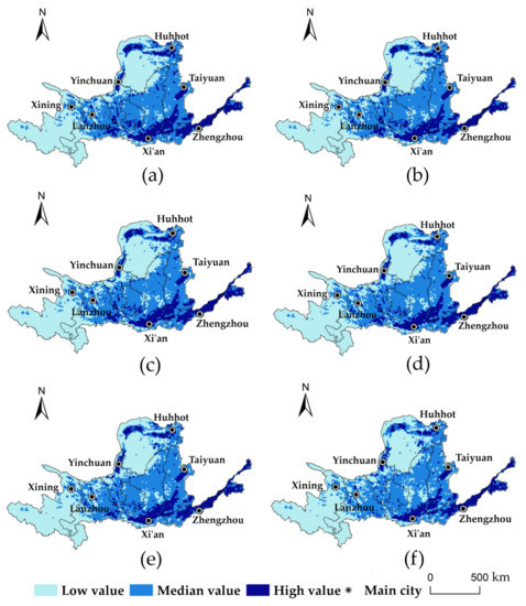 Spatial distribution of ecological benefits of land use in the Yellow River Basin: (a) 1995; (b) 2000; (c) 2005; (d) 2010; (e) 2015; (f) 2018.