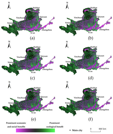 The superposition of economic, social and ecological benefits of land use in the Yellow River Basin: (a) 1995; (b) 2000; (c) 2005; (d) 2010; (e) 2015; (f) 2018.