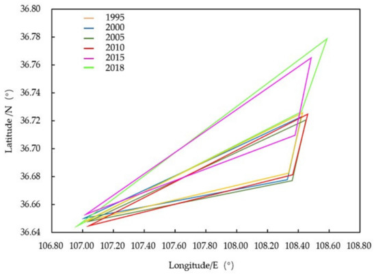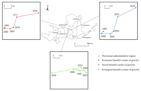 The movement of the geographical center of gravity can reflect the change in dominance of the land use benefits obtained. From 1995 to 2018, the economic, social, and ecological benefits’ center of gravities of land use were all in the central region of the Yellow River Basin (Figure 9). The center of gravities of economic and social benefits moved to the northeast, with average speeds of 3 km/year and 1.73 km/year respectively. The center of gravities of ecological benefits moved left in 1995–2000, right in 2000–2010, and left in 2010–2018. Compared with 1995, the center of gravity of ecological benefit moved slowly to the southwest, with an average speed of 1 km/year. By observing the land use benefit’s gravity center triangle (Figure 10), it moved slightly to the southeast from 1995 to 2005, then gradually moved to the northwest from 2005 to 2018. Finally, the entire barycenter triangle in 2018 was located above that in 1995, which reflected the slow northward movement of the benefits’ high-density areas from 1995 to 2018. This is because the governance of the Yellow River and the development and construction of the poor areas in the upper and middle reaches of the Yellow River promote the gradual shift of the socio-economic focus from the east to the north, which reduce the big regional development differences.