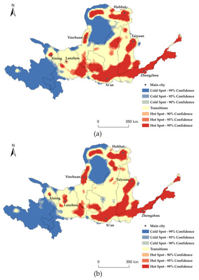 Hot spots distribution of land use benefits in the Yellow River Basin: (a) 1995; (b) 2018.
