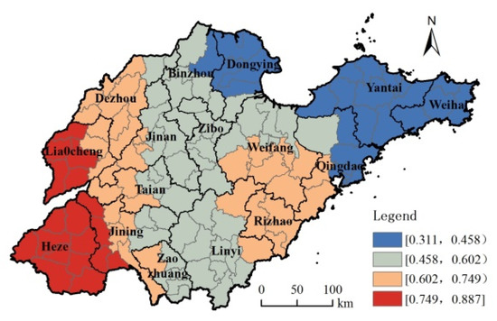 As can be seen from Figure 3 and Table 3, the transition index of rural residential land at each county level in Shandong Province gradually decreases with the fitting curve characteristic of power function (R2 = 0.9117), and the sequence mutations between each unit are obvious. Taking the mutation point as the critical value, the transition stage of rural residential area was divided into five stages from the primary stage to stable stage by the breakpoint method. This indicates that from the lower stage to the higher stage, the balance between rural residential land and other construction land gradually tends to a new state, which is basically consistent with the theory of rural homestead transition proposed by Long [32] and its application results along the Yangtze River [49].