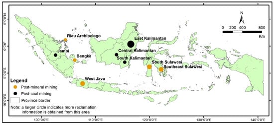 Globally, many mining sites are located in forest areas, including in Indonesia, and reforestation is still considered the best choice in providing ecological and economic benefits [14]. Several national-scale mining companies (the distribution can be seen in Figure 1) have proven how they conduct post-mining landscape reclamation and reforestation activities, especially post-mining lands, which were originally a forestry area that was loaned to extract mining materials. The main problem in reforestation of post-mining sites refers to the degraded condition of forest tree growth ranging from high toxicity coming from different pollutants, lack of macro and micronutrients, organic matter, and disturbance of water regime in soils [15]. Reforestation activities that aim to return the sites to their original baseline condition become very unlikely [16]. Efforts to cover overburdened areas with hydroseeding technology are the first step to reduce surface erosion. The success of planting fast-growing tree species and some technological inputs to increase soil fertility has become the main direction for mining companies [17].