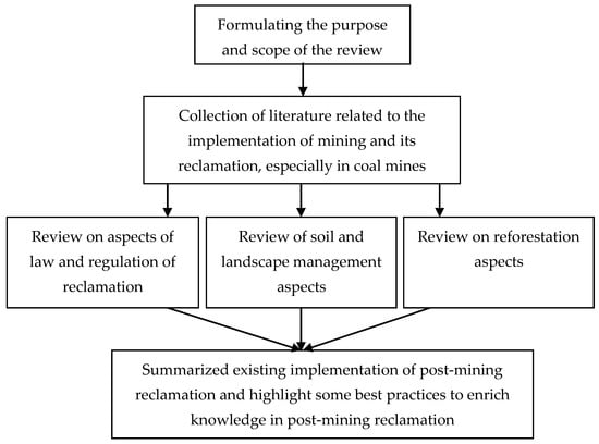 This paper evaluates the long-term results of managing and reforesting degraded post-coal-mining landscapes, and post-mineral mining as a comparison. As shown in Figure 2, the review carried out in this study includes current knowledge concerning the national policy of mining exploitation and reforestation in post-mining lands, the physical and engineering processes, and landscape management in post-mining lands. It also involved the biological aspects. These aspects are concerned with the strategy for selecting and planting forest tree species to encourage the reforestation of indigenous tree species and the rehabilitation of soil fertility in degraded post-mining lands; the development and the application of soil microbes, monitoring changes in plant and animal ecology, and the role of hydro-seeding technology for promoting cover crops and plant colonization in degraded post-mining lands.