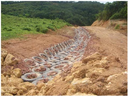In Indonesia, as a humid tropical country, the rain falls evenly throughout the year with a fairly high average monthly rainfall. The high rainfall intensity during the wet season can lead to erosion and landslides in reclamation areas, which always become a major concern to control. To overcome this condition, the Ministry of Energy and Mineral Resources issued Technical Guidelines for Erosion Control in General Mining Activities (Decree of the Director-General of General Mining No. 693.K/008/DDJP/1996), which contains erosion control techniques, both vegetatively and civil engineering [18]. Due to the materials that formed the reclamation area were often dominated by fine earth-sized fractions that were easily eroded by water flow; waterways were reinforced with rock blocks or used tires, as shown in Figure 3. Escarpments formed due to terrace construction or morphological changes due to the construction of waterways are stabilized with rock blocks, rip-rap, or gabions.