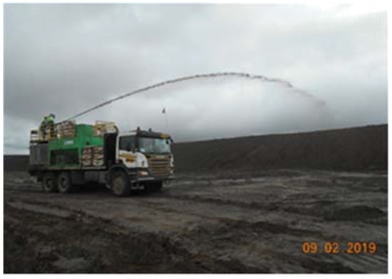 The sowing of cover crops on post-coal-mining land used the traditional sowing methods by humans. However, several coal mining companies used hydroseeding methods. The spreading cover crop seed on the soil surface was applied by using hydroseeding technology, especially on steep slopes or rough terrain, where the use of other equipment was difficult [17]. In comparison with the traditional sowing of spraying the LCC and grass by humans, the hydroseeding technology was more beneficial in terms of fast and homogeneous application, representing a reasonable choice for planting among other soil engineering methods [105]. The materials for hydroseeding application on post-coal-mining landscapes in Indonesia involved a mixing mulch of wood fibers, local microorganisms, adhesive, compost, charcoal, and ash, or a mixing mulch of tackifier agent, water, compost, rice husk, sawdust, and urea. In some coal mining companies, the hydroseeding technique was used for planting pioneer plant seeds, such as the genera of Leguminosae, Poaceae, and Cyperaceae. The hydroseeding technique could be used for planting species of Leguminosae (Cajanus cajan, Crotalaria pallida, D. triflorum, Indigofera spicata, Sesbania grandiflora), Poaceae (Eleusine indica, Sporobolus indicus, P. conjugatum), and Cyperaceae (Cyperus brevifolius, C. odoratus, Kyllingia monocephala) in Tanah Laut, South Kalimantan, Indonesia [106]. This technique was applied and combined with a jute net for planting C. mucunoides, C. pubescens, and P. javanica, on the steep slope, where it was difficult to replant it, where the soil was easily eroded by rainwater due to the coal exploitation process [107]. The hydroseeding application on post-coal-mining landscapes is presented in Figure 6 and Figure 7.