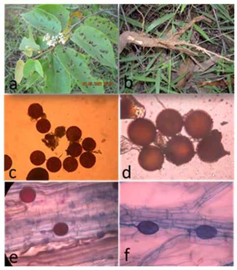 Native arbuscular mycorrhizal (AM) fungi colonized the shrub roots of Commersonia bartramia (Sterculiaceae) in degraded post-coal-mining lands in South Kalimantan, Indonesia; (a,b) shoot and roots of C. bartramia; (c,d) spore of native AM fungi associated in the rhizosphere of shrub growing in post-mining lands; (e,f) arbuscules and vesicles found in root systems of C. bartramia.