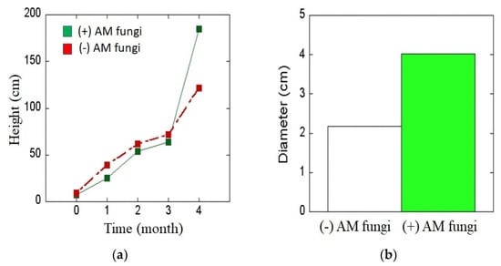 Reforesting post-coal-mining using Sesbania grandiflora inoculated with Arbuscular Mycorrhizal (AM) fungi and without AM fungi: (a) shoot height 1 to 4 months after transplanting, (b) diameter 4 months after transplanting [150]; (the histogram has been modified).