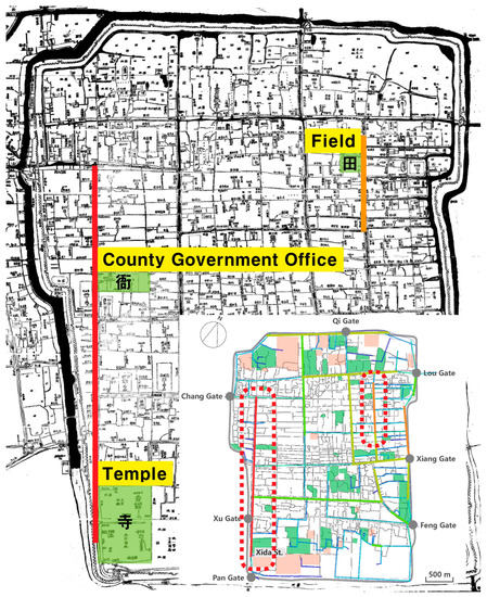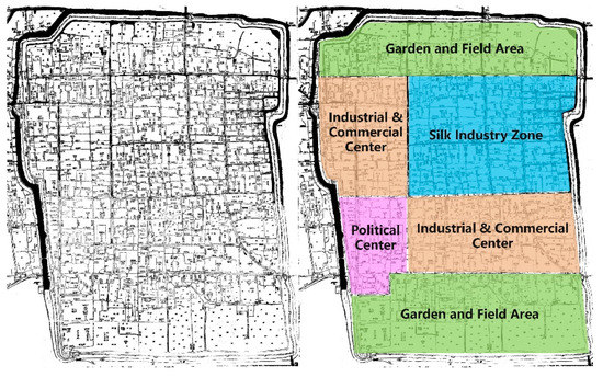 Drawn in 1745, the Map of Suzhou City is an ancient map of Suzhou City from the middle of the Qing Dynasty. It is the most complete map that has been preserved after the Map of Pingjiang City of the Song Dynasty (AD 960–1279) and the Water Sources in Suzhou Prefecture of the Ming Dynasty. The whole map is well scaled with accurate orientation and detailed labels. There are 612 streets and alleys, 128 temples, 28 ancestral halls and 25 government buildings, as well as more than 100 gardens and farmlands with text annotations in the map [21], which have provided a favourable condition for translating it into a practical historical map with scientific scales. As shown in Figure 1, gardens and farmlands were located at the southern and northern ends of Suzhou City; the industrial and commercial centre was situated in the northwest area near Chang Gate; the political centre in the southwest area was located near Xu Gate; the silk-weaving district was located in the northeast area near Lou Gate and the commercial district was located in the southeast area near Feng Gate [22].