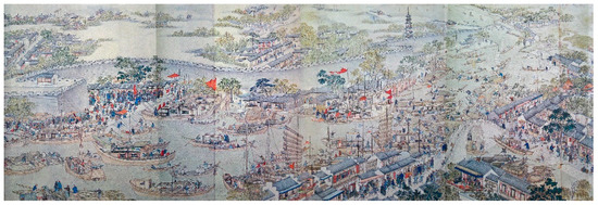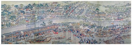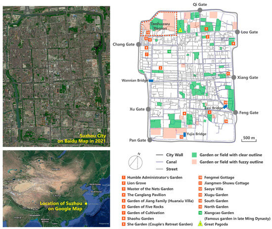 Since the late Ming Dynasty (AD 1368–1644), Suzhou City, the national cultural and trade centre at that time [1,2,3,4], had become a commercially prosperous and densely populated [5] city with high land prices [6,7,8]. By that time, garden culture had infiltrated all aspects of life [9,10,11]. Large areas of land in Suzhou City were covered by gardens [12]. There were more than 80 recorded gardens in existence in the Ming Dynasty, and more than 100 by the time of the Qing Dynasty (AD 1644–1912) [13], a majority of which were built during the reign of Emperor Qianlong [14]. The reign of Emperor Qianlong was another period of large-scale construction of Suzhou gardens after the late Ming Dynasty. The locations, scale, water sources and artistic merits of Suzhou gardens were deeply affected by urban development in the Qing Dynasty [15]. The intrinsic association between gardens and the city was an important part of urban landscape and life in Suzhou City [16].
