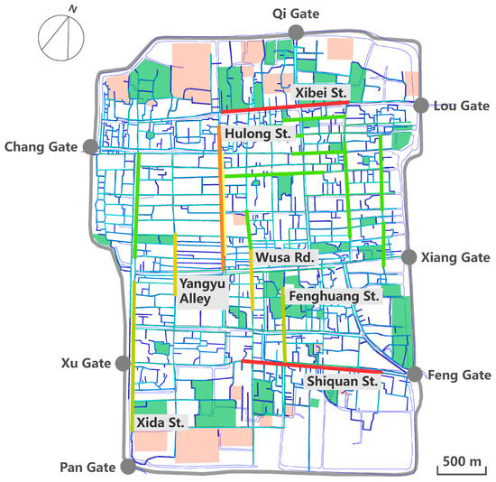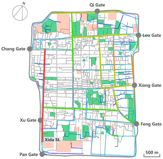 The canal axis model analysis (Figure 5) indicated that the north–south canal marked in red, which flowed from Chang Gate to Pan Gate, showed the highest integration. This canal ran parallel to intermediately integrated Xida Street. There were a small number of garden plots distributed around it. The two canals marked in orange that ran north–south through the developed silk-weaving district near Lou Gate were the second most highly integrated canals, which shared similar garden distribution to the canal with the highest integration. The canals marked in yellow were intermediately integrated. They were located in the areas around Qi Gate, Lou Gate, Xiang Gate and the silk-weaving district. Gardens were more densely distributed along these canals than along those with higher integration. Canals marked in light green had average integration, but they were surrounded by more gardens. Despite their low integration, the canals marked in light blue and dark blue were surrounded by many small garden plots.