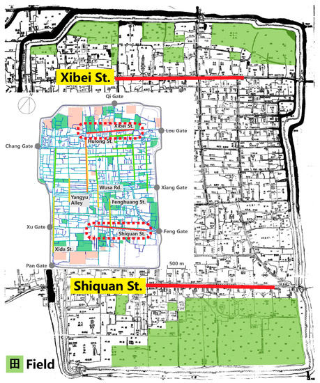 As shown in Figure 3, the streets marked in light green in the street axis model analysis were blocks with an average degree of integration. They were residential areas around which a small number of gardens were scattered. The rest of the streets (marked in light blue and dark blue) not only had a poor degree of integration but also had fewer gardens distributed around them. For example, the streets along the area on the north side of Xibei Street and the south side of Shiquan Street that extended to the city wall had a very low degree of integration. Although large green areas surrounded them, the Map of Suzhou City has shown that these green areas were all farmland (Figure 4). Only one or two blocks near Xibei Street and Shiquan Street had gardens. Suzhou gardens were distributed mostly at the southern and northern ends of the city and were developed in commercial and mixed residential–commercial areas during the peak of the Qing Dynasty. Few gardens were located in residential areas with only residential functions. Thus, we concluded that the distribution of Suzhou gardens was tightly connected to the economic and trade districts in the city during the reign of Emperor Qianlong. Gardens were more densely located in areas with busier commercial activities.