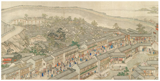 Yuan Jinglan, a native of Suzhou in the Qing Dynasty, in his Opening the Garden at Qingming Festival records the Humble Administrator’s Garden, Lion Forest and Canglang Pavilion as the leading gardens, and most of the gardens are open to visitors from the Qingming Festival to lixia (start of summer) [72]. Yuan noted: “In spring, the gardens open, and places for eating, lodging, and carriages are set up. Gardeners will ask visitors for money to enter the garden to enjoy the flowers. At that time, there will be a crowd of women, noisy carts and horses, and loud voices, making it too crowded to walk”; when the gardens opened, there were people selling candy, bait and small toys [72]. As Shen Fu described in Six Chapters of a Floating Life, written in 1793, he and his wife travelled to the South Garden near Canglang Pavilion and the North Garden in Chang Gate area when the rape blossomed [73]. Yuan Jinglan’s Appreciating Rapeseed Flowers in the North Garden and South Garden noted that restaurants and tea houses were located everywhere to entertain tourists [74]. Qian Yong’s Lyuyuan Garden Collection noted that in spring (February and March), when peach blossoms and rape blossoms bloomed, all the people in the city came out to visit the Lion Grove Garden, as seen in Zhang Zeduan’s painting of Along the River During the Qingming Festival [68]. It also can be seen that during the Qianlong period, the gardens in the commercial area were not only separated from the commercial, public space as a private sector but also opened in the blooming season, making them a place for public leisure. Furthermore, they promoted commercial development and consumer culture around the garden. The entertainment functions and convenience facilities provided by the commercial premises also attracted a large number of visitors, which assisted in the preservation and continuation of the garden.