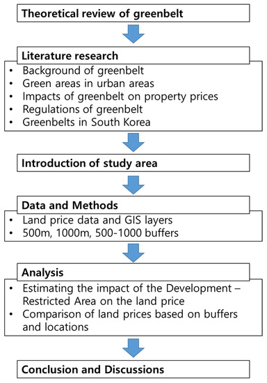 There is a limitation in that these studies cannot show how the setting of the greenbelt affects property prices within the greenbelt. When lands are designated as greenbelts, surrounding buildings and land are affected, and there are many existing studies on this subject. However, the person most affected by the designation of the greenbelt is the landowner within the greenbelt. Research on their impact is difficult to find and needs to be considered. The main aims of this research are as follows: (1) finding the impact of regulation that restricts land development on land price by adopting regression models; (2) determining the effect of proximity to greenbelts by calculating the difference in land price based on distance from the boundary; and (3) estimating the total effect of greenbelts on land price in the study area. To address these issues, in this study we examined the economic effects of the DRA in three districts: Seo-gu, Dong-gu, and Deokyang-gu in Goyang city, South Korea, where DRAs occupy a large proportion of the administrative area. This study also used spatial analysis technology to support the assumption that the inner and outer boundaries of greenbelts affect the land price, especially based on the distance. This study is organized into stages, as shown in Figure 1 below.