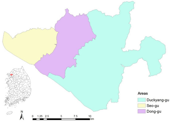 Location of three areas in Goyang city: Seo-gu, Dong-gu, and Deokyang-gu.