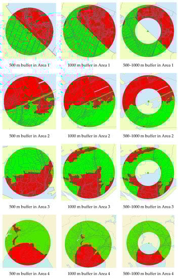 To evaluate the robustness of regression models, the RMSE, MAPE, MASE, and AIC of the models were observed. RMSE is frequently used to measure the differences between values predicted by a model and the values observed. Generally, a lower value is better than a higher one. MAPE is one of the most common metrics to measure the forecasting accuracy of a model. The lower the value for MAPE, the better a model is able to forecast values and the lowest MASE is the preferred method as well [68]. The results showed that the RMSE value was low, except for the 500 m buffer model in Area 3, which showed the highest value among the models. The MAPE value of the regression analysis was a minimum of 3.16% in Area 1 to a maximum of 7.1% in Area 2. Based on the values of each indicator, except AIC, the 500 m buffer model was the worst model, while the 1000 m and 500–1000 m models in Area 4 might be better than the other models. In the case of AIC, models with a small buffer (500 m) showed low AIC as shown in Table 3.