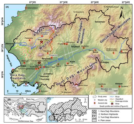 The study area comprises the Bakırçay River catchment (ca. 3382 km2) and the neighboring Madra River catchment (ca. 382 km2), and the adjacent coastal areas along the Aegean Sea (Figure 1A). It includes a major part of the Pergamon Micro-Region [28], where important natural resources (such as stone as a building material, clay for ceramic production, soil for agricultural production, and water as a daily necessity) have been utilized to supply the city of Pergamon [17,43,58]. Located between 38°54′–39°29′ N and 26°48′–27°57′ E, this area extends approximately 100 km in the E–W direction and 66 km in the N–S direction, covering an area of ca. 4124 km2.