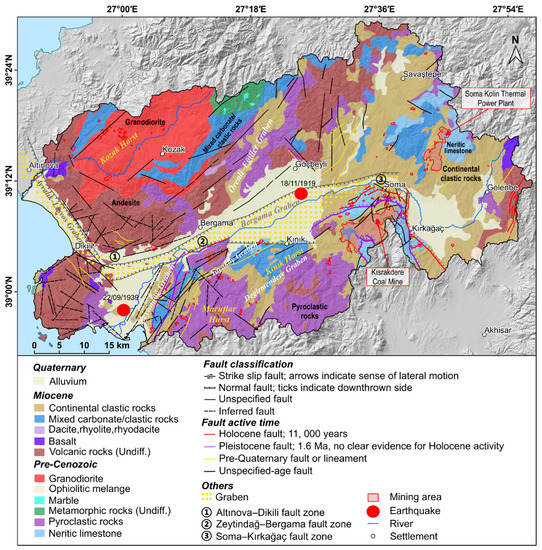 Geological map of the Bakırçay and Madra River catchments and their adjacent coastal areas. Data: (1) bedrock: Geological Map of Turkey, 1:500,000 (İzmir) [60]; (2) fault: 1:250,000 scale Turkey Active Fault Maps [69,70,71,72] and the unspecified-age fault (black line) [45,60,73]; (3) location of graben, horst, and fault zones [45]; (4) mining area: Google Earth satellite images (WorldView-2, last accessed 8 June 2020); (5) earthquake epicenter of M ≥ 6.5 since 1900 [68].
