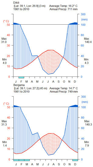 Located in the Aegean Region, the study area has a typical Mediterranean subhumid climate [77]. The area is characterized by dry and hot summers, and mild and wet winters (“Csa” climate according to the Köppen–Geiger classification [78]). Between 1981 and 2010, the annual temperature averaged 16.2 °C in Dikili and 14.7 °C in Bergama, and the annual precipitation averaged 711 mm in Dikili and 749 mm in Bergama (Figure 3). At both locations, most rain falls in December and January, reaching 140 mm per month; the dry period spans from May to October (Figure 3). The maximum precipitation recorded at the meteorological station in Dikili between 1939 and 1996 totaled 183 mm within 24 h [74].