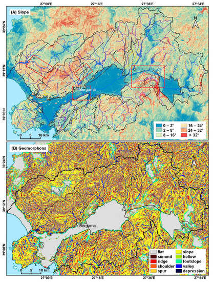 The entire area of the Bakırçay and Madra River catchments has a mean elevation of ca. 377 m (σ = 233 m) with an elevation range of ca. 1432 m (Table 2). Corresponding to the mountainous relief, the slope inclination averages around 12°, with steep slopes regularly exceeding 10° in the mountains and flat–gentle terrain less than 3° in the plain areas (Table 2; Figure 5A). Landform units as displayed by geomorphons are dominated by slopes and spurs in the mountainous areas whereas the geomorphon flat prevails in plain areas (Figure 5B). All of these geomorphometric parameters clearly show spatial diversities in different (sub)units (Figure 5 and Figure S7).