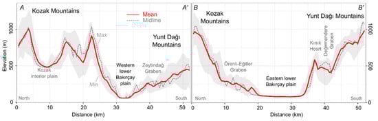 Swath profiles (for location see Figure 1A), indicating distinctly asymmetrical geomorphological characteristics between the Northern Highlands and Yunt Dağı Mountains surrounding the western lower Bakırçay plain (A–A’) and the eastern lower Bakırçay plain (B–B’). Note: 20× vertical exaggeration.