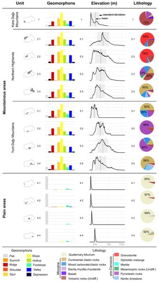 Corresponding to the major lithological (Figure 2) and geomorphological characteristics (Figure 4), the study area was divided into the four major geomorphological units—1—Kara Dağı Mountains, 2—Northern Highlands, 3—Yunt Dağı Mountains, and 4—Plain areas—with a total of thirteen subunits (Figure 1C).